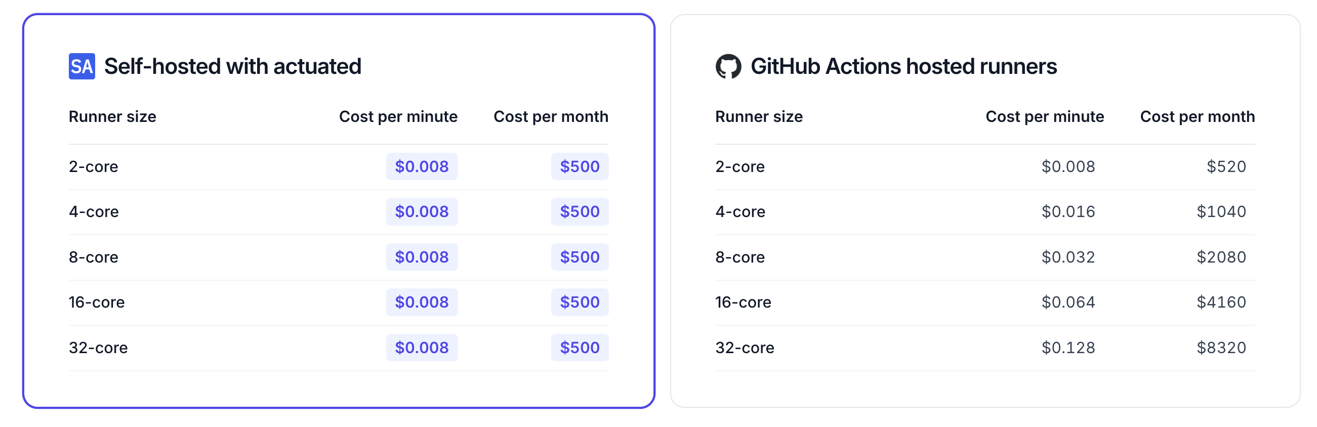 Our pricing calculator shows how easy it is to save money compared to GitHub's hosted runners, especially once you start needing more than 2x vCPU for jobs.